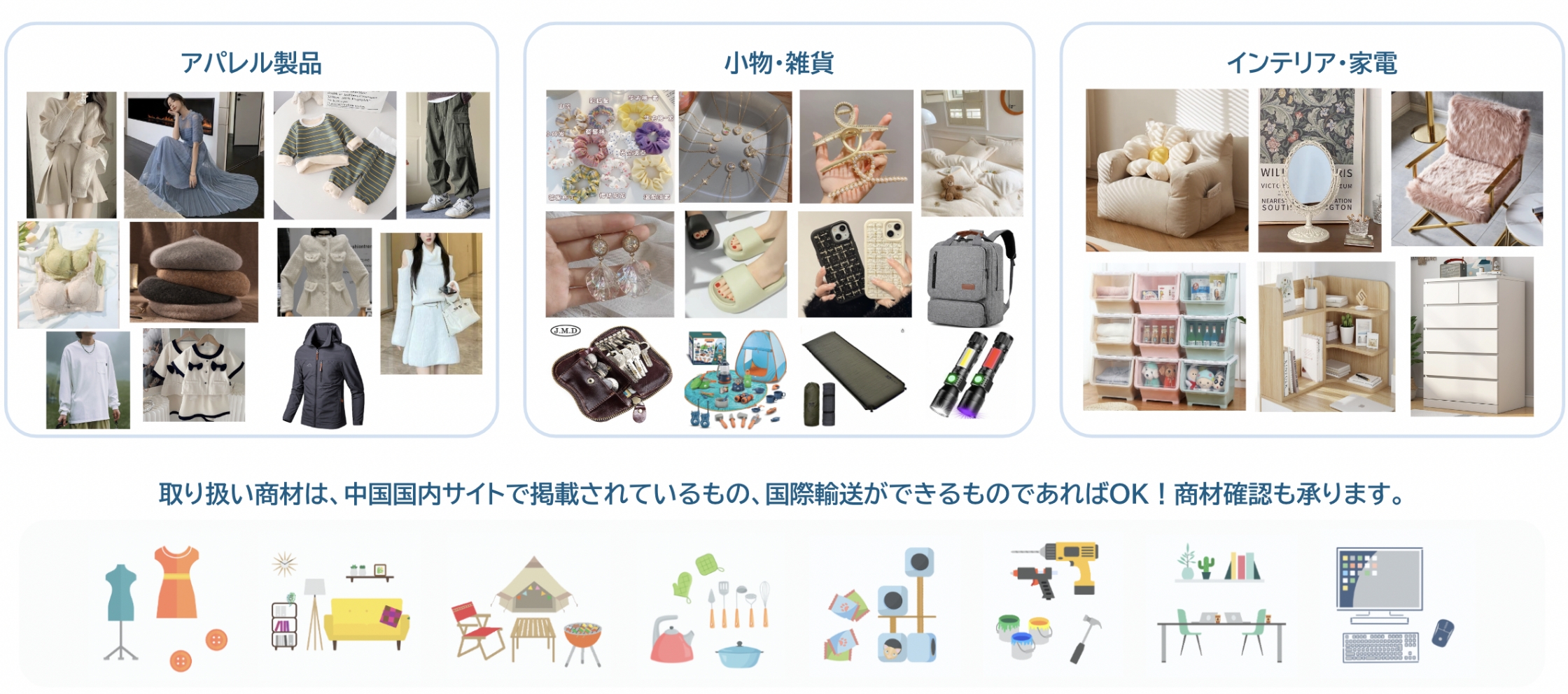 取扱商材は、中国国内で掲載されているもの、国際輸送ができるものであればOK!商材確認も承ります。